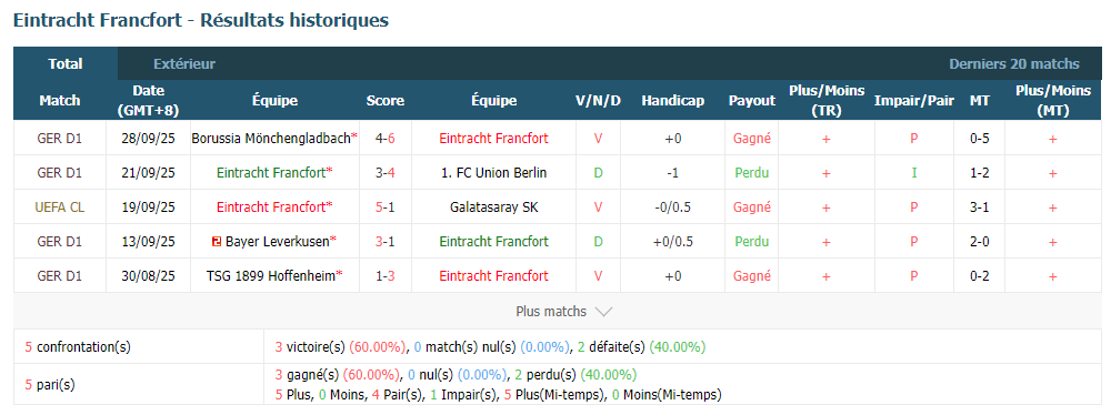 Eintracht Francfort a inscrit 18 buts dans ces 5 derniers matchs officiels.