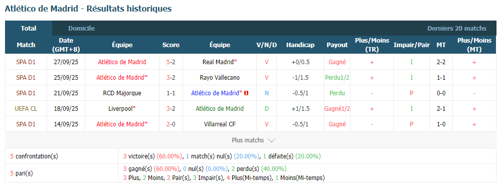 Atlético reste invaincu à domicile en Liga depuis la nouvelle saison avec 3 victoires et 1 nul. D'ailleurs, il a gagné 4 victoires et subi 1 défaite à domicile en LDC la saison dernière.