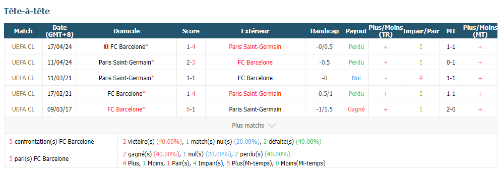 Le Barça reste invaincu dans ces 8 derniers tours de la phase de ligue de la LDC avec 7 victoires et 1 nul, alors PSG a gagné 11 victoires et subi 2 défaites dans ces 13 derniers tours de la LDC. En conséquence, on conjecture que c'est un match nul après un combat violent.