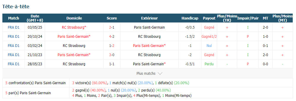 PSG a gagné toutes ces 6 dernières rencontres à domicile contre RC Strasbourg. Ce premier a inscrit au moins de 3 buts par match dans 4 de ces 5 dernières. En conséquence, il est facile pour PSG de gagner ce match.