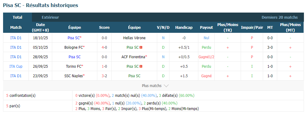 Pisa SC a gagné 1 nul et subi 2 défaites à l'extérieur en ligue cette saison.