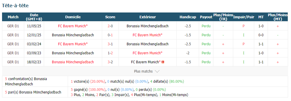 FC Bayern Munich est le seul qui ait gagné tous les tours de la ligue. Il a inscrit 27 buts dans ces 7 derniers tours. Contrairement, Mönchengladbach n'a pas encore gagné de victoire en ligue cette saison. Il a encaissé 2,5 buts en moyenn par match à domicile. En conséquence, on croit que ce premier gagnera ce match.