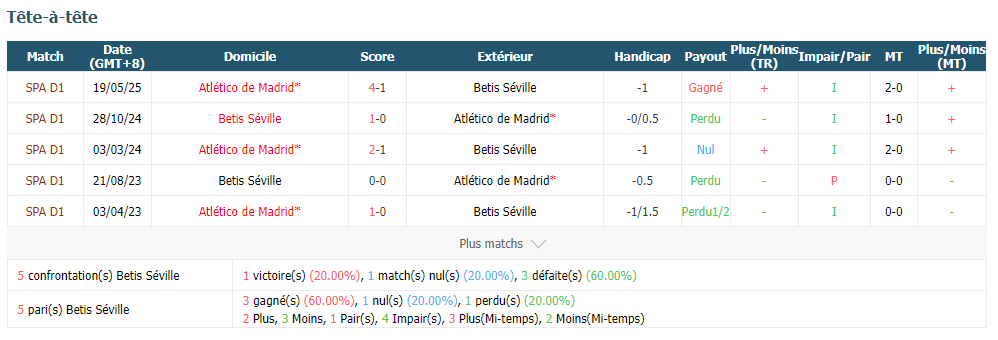 Atlético reste invaincu dans ces 8 derniers tours de la ligue, alors Betis Séville a gagné 3 victoires et 2 nuls dans ces 5 derniers tours où la forme de Cucho Hernández est excellente, mais ce dernier est inférieur dans les confrontations. En conséquence, Betis Séville devrait viser à gagner 1 nul cette fois.