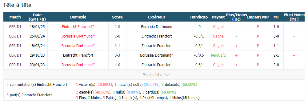 Eintracht Francfort a vaincu FC St. Pauli dans le match dernier (2-0). C'est sa première victoire de ces 5 derniers matchs.