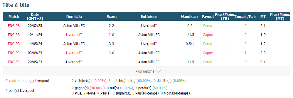 Liverpool reste invaincu pendant le temps réglementaire dans ces 10 dernières rencontres contre Aston Villa FC avec 7 victoires et 3 nuls, mais ce premier a un grand trou sous le dirige d'Arne Slot pour l'instant. Il est le 4e tenant du champion qui ait subi 4 défaites consécutivement en EPL dans l'histoire. En conséquence, le domicile ne peut que gagner 1 point cette fois.