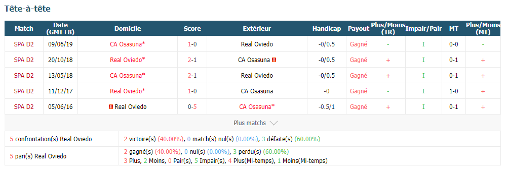 Real Oviedo a perdu 7 des 10 tours de la ligue cette saison, comprenant 6 avec au moins de -2 buts différents. D'autre part, CA Osasuna a perdu tous les 5 déplacements de la ligue cette saison. Comme aucun n'a une assurance de gagner la victoire, on conjecture que c'est un match nul.
